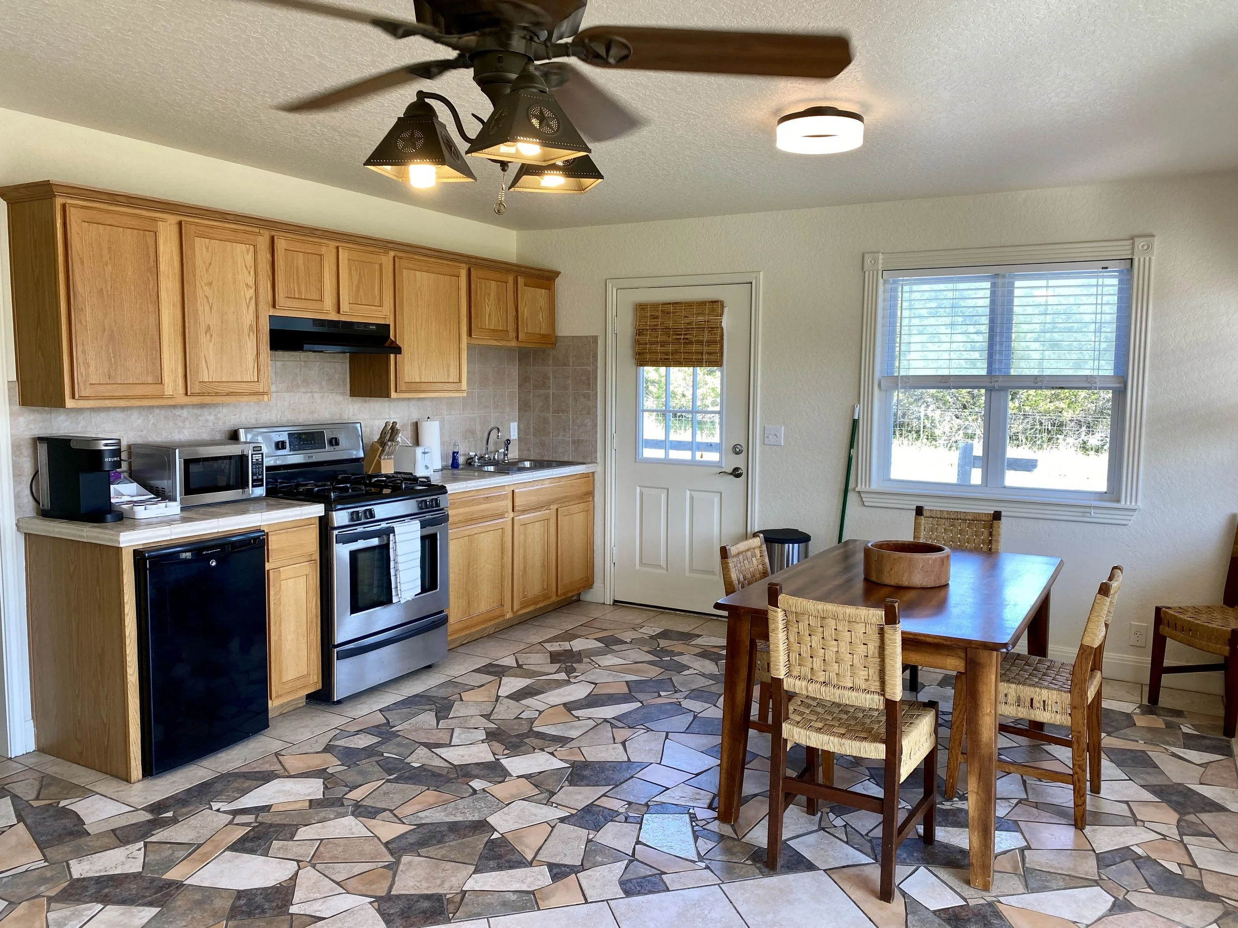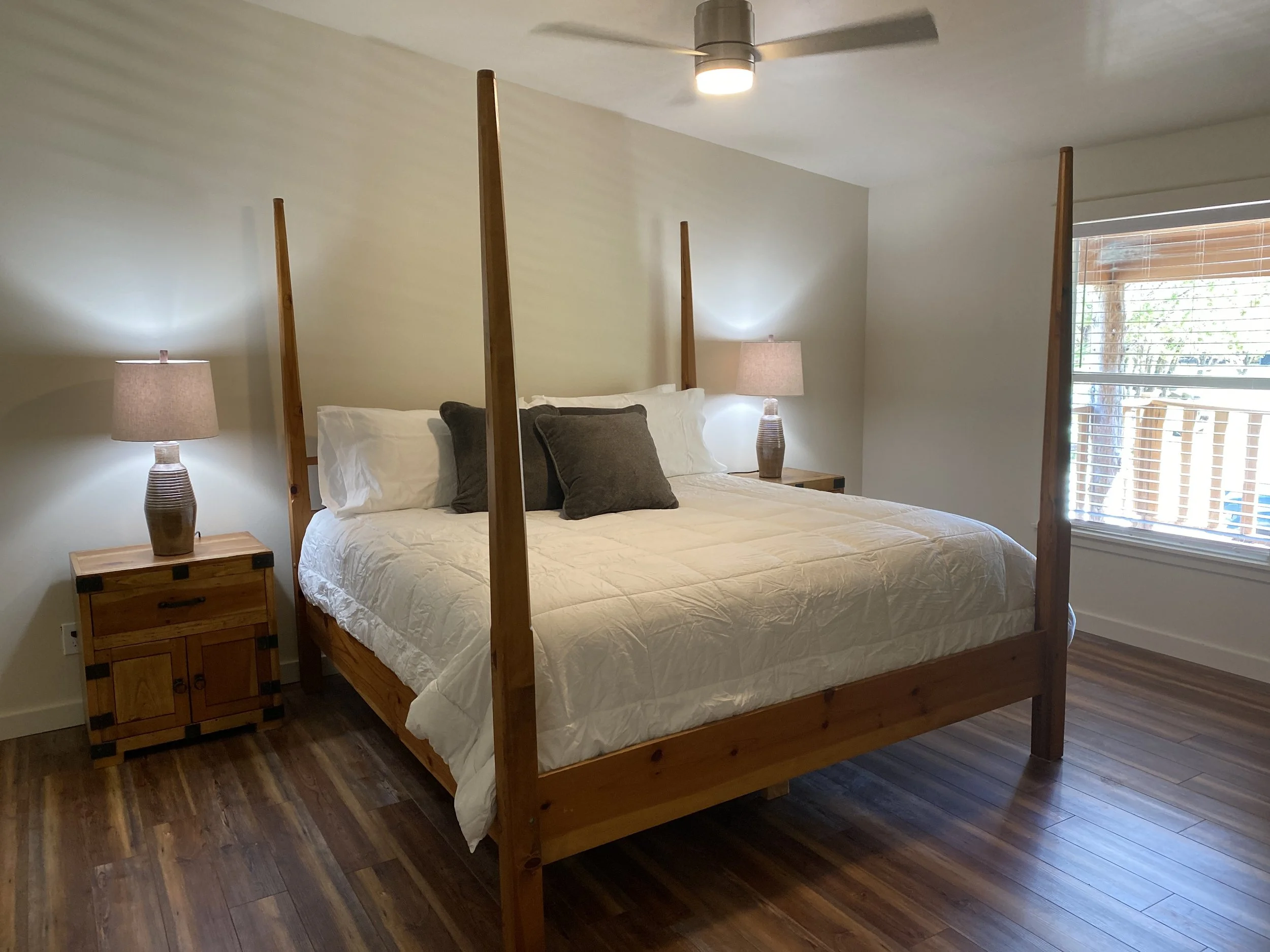 Separated into Upper and Lower, Riverview has two balconies (front faces the Guadalupe River and the rear is a great place to watch deer and other wildlife roam the property. It has a large living room with lots of seating and Roku TV, and stocked kitchen and dining area. The lower and upper units are not connected from the inside - totally separate, each with their own private entrance and parking area.