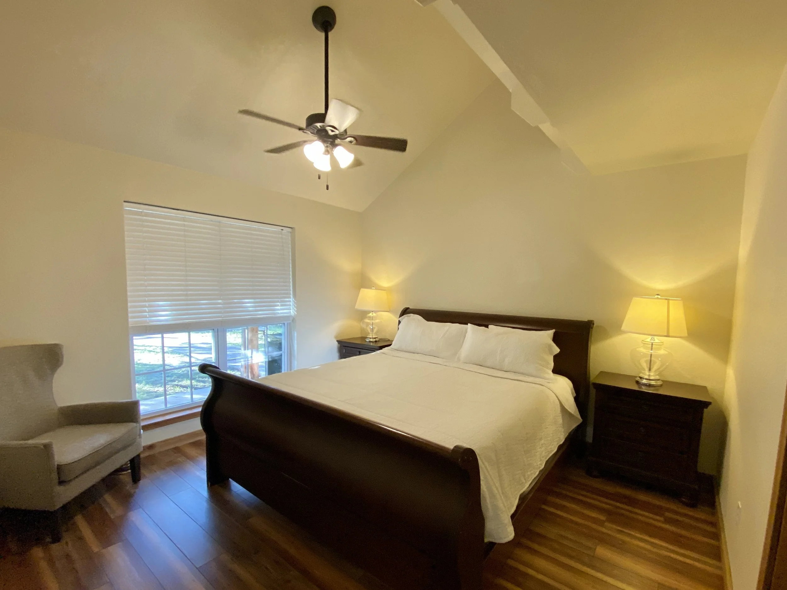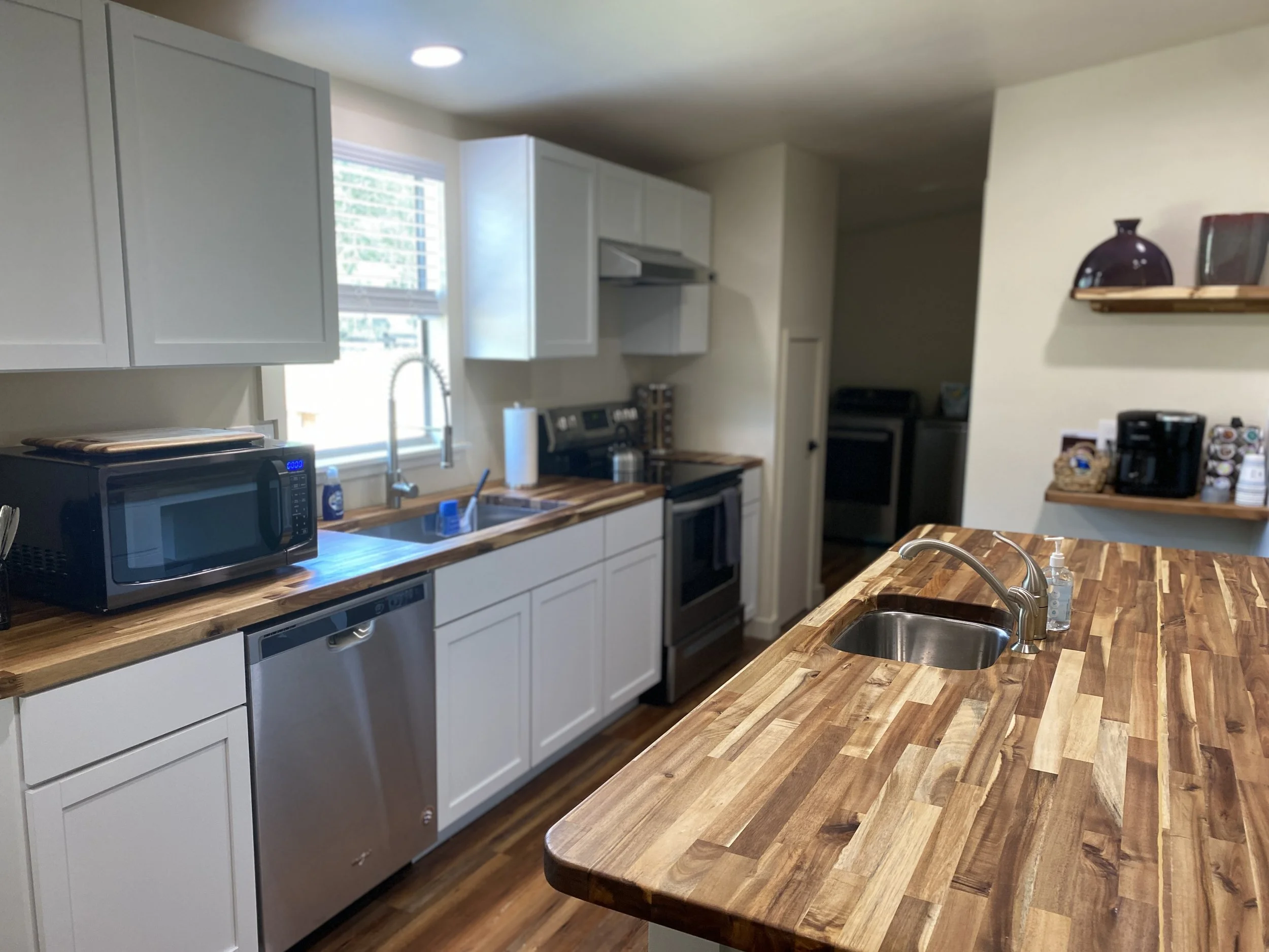 As a recent remodel in a private area of our property, the North House can comfortably sleep 12 people (7 beds), has a full kitchen, living/dining area, and Roku TV. Plenty of places to relax outside on the cedar-fenced deck, which includes a gas grill and deck chairs. Enclosed back yard. Free Wi-Fi.